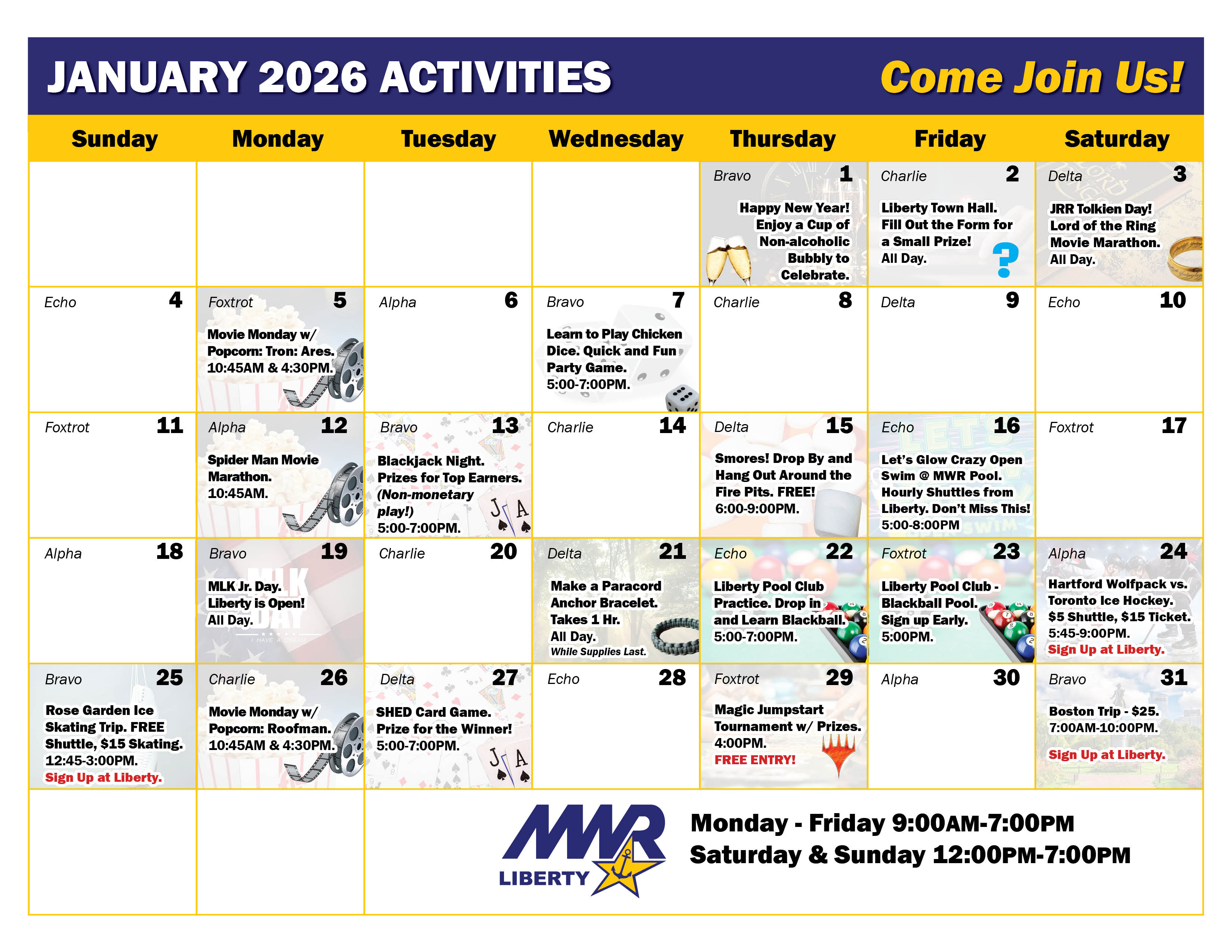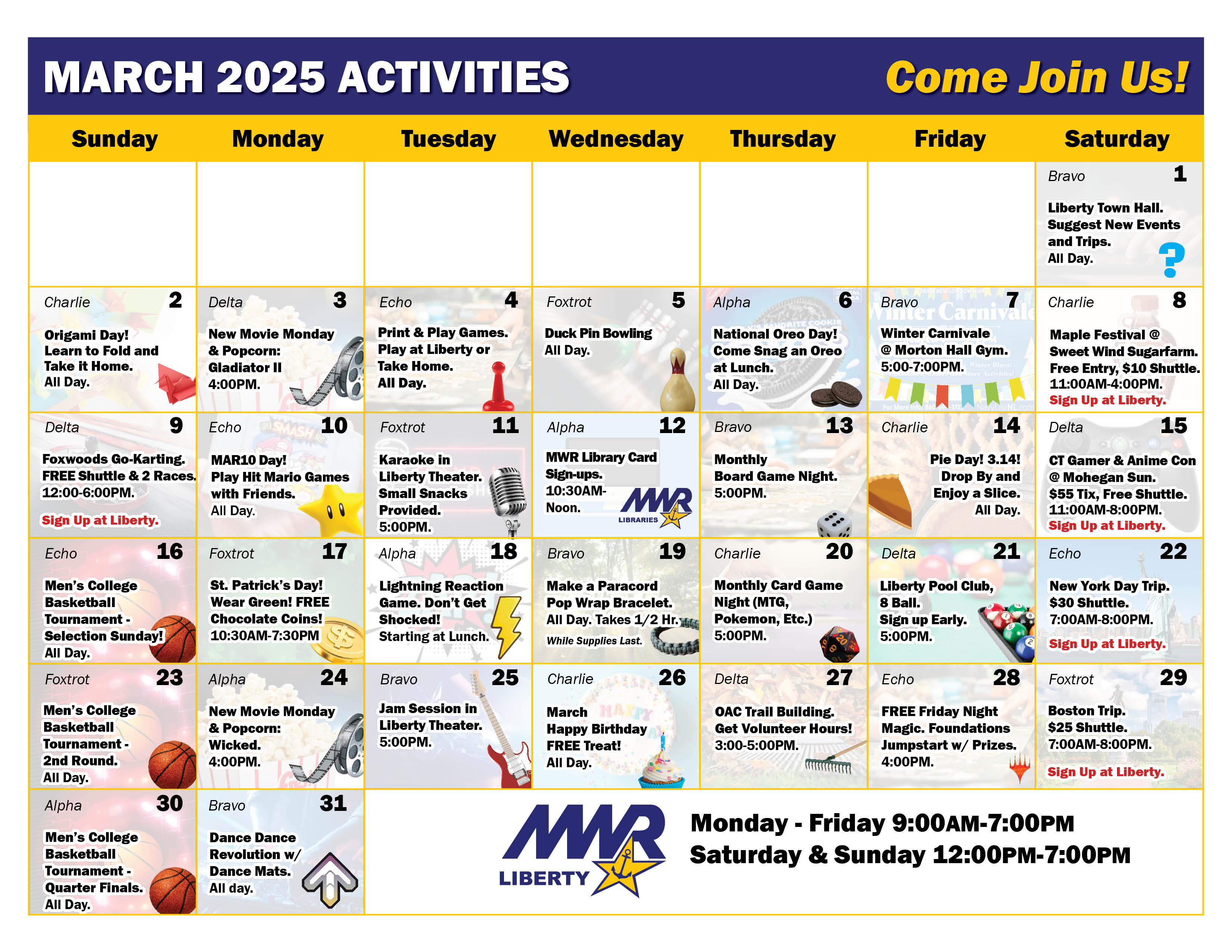 Most events at the Liberty Center are free of charge. A nominal fee is charged for some activities and trips off base.
