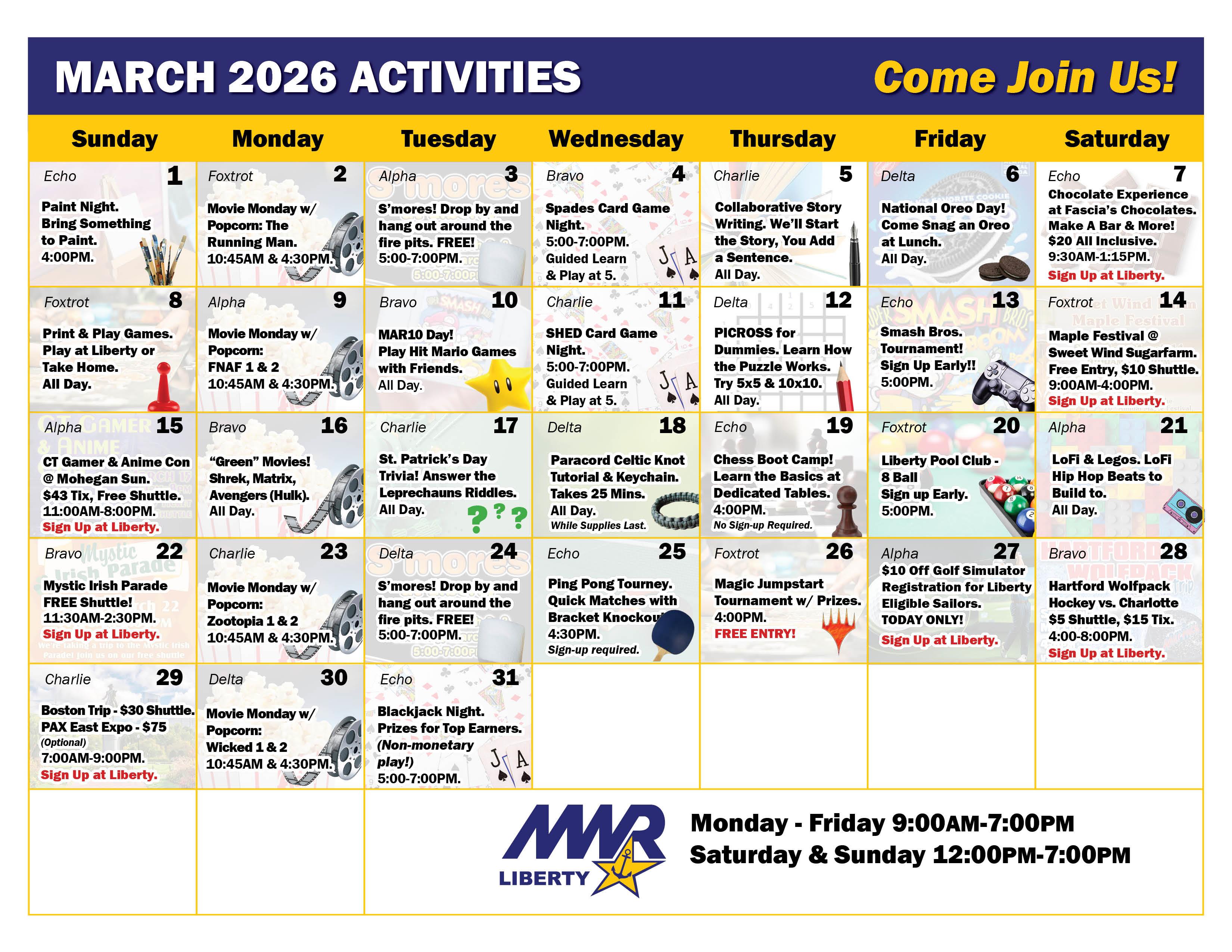 The Liberty Center provides high-energy quality of life programs to the 18 to 25 year old single sailor and unaccompanied sailor population living at SUBASE. The program offers superior entertainment experiences and development of personal leisure skills. Leading to extraordinary and unique opportunities for the sailor to enjoy the activity or adventure in an alcohol and tobacco-free environment.