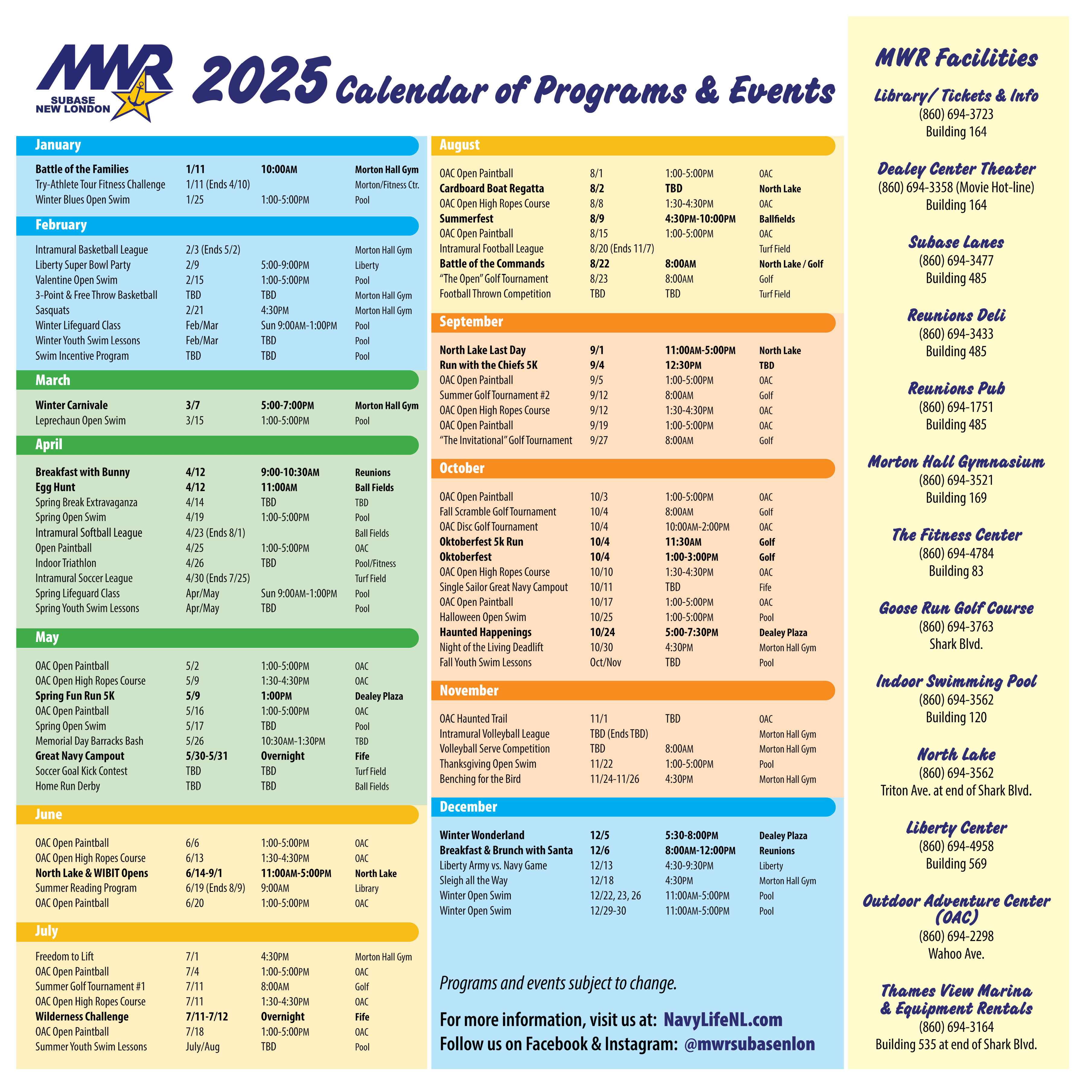 MWR Goose Run Golf Course is a 9-hole golf course (2,466 yard, PAR 34) located on base and with breath taking views of the Thames River. The clubhouse was completely renovated on 2012. It now houses the pro shop, a fully serviced food and beverage area with plenty of seating both indoors or outdoors on the fantastic deck overlooking the river. Catering is available for your special event.