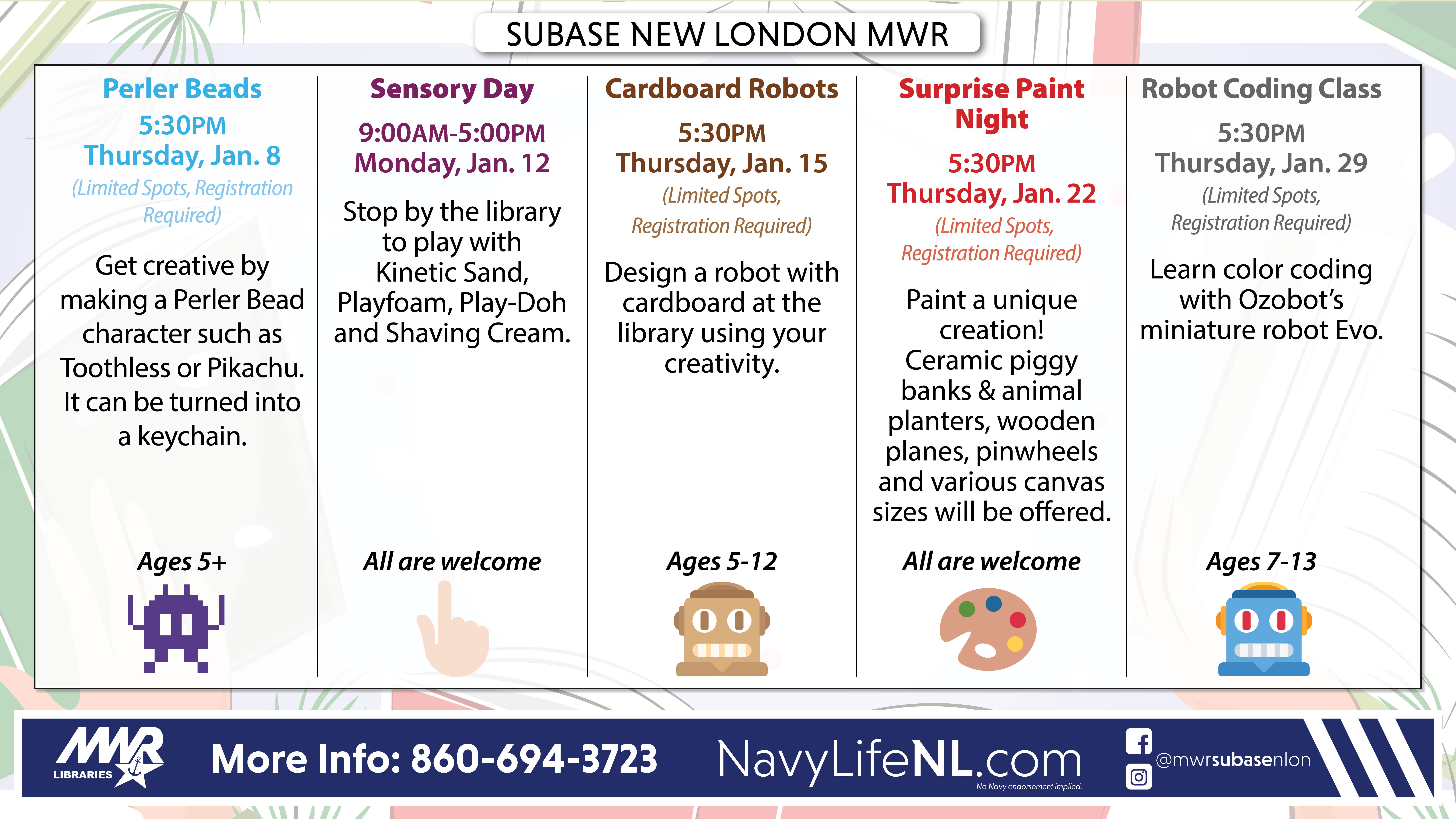 SUBASE Library is known for its wide variety of programs for all ages, including the Summer Reading Program, United Through Reading, storytimes and so much more. The Library has two more spaces, the conference room and multi-purpose room, which are great for FRGs, training, homeschool meet-ups, meetings and many Library programs and events. Call us or stop by to reserve the room! 860-694-3723
